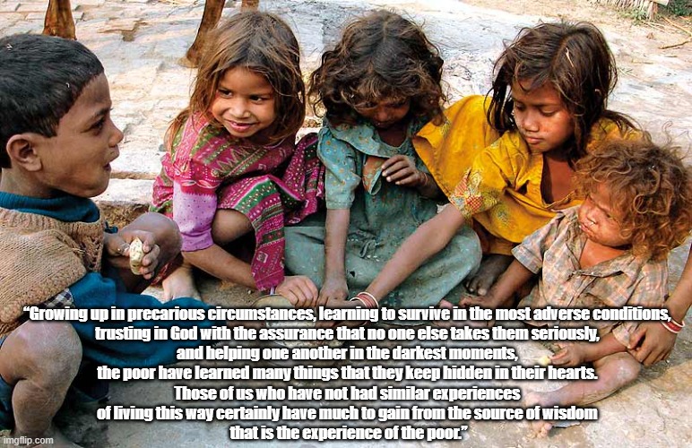 - “Growing up in precarious circumstances, learning to survive in the most adverse conditions, trusting in God with the assurance that no one else takes them seriously, and helping one another in the darkest moments, the poor have learned many things that they keep hidden in their hearts. Those of us who have not had similar experiences of living this way certainly have much to gain from the source of wisdom that is the experience of the poor.”