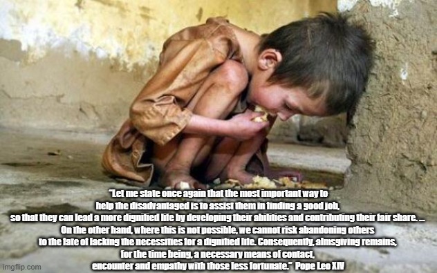- “Let me state once again that the most important way to help the disadvantaged is to assist them in finding a good job, so that they can lead a more dignified life by developing their abilities and contributing their fair share. … On the other hand, where this is not possible, we cannot risk abandoning others to the fate of lacking the necessities for a dignified life. Consequently, almsgiving remains, for the time being, a necessary means of contact, encounter and empathy with those less fortunate.”