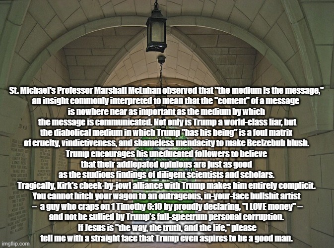 In effect, God's government is replacing faulty human government. To me this sounds a lot like "thoughts and prayers" whenever another batch of kids is killed - carnage that Charlie Kirk considered an unfortunate, but necessary "cost."